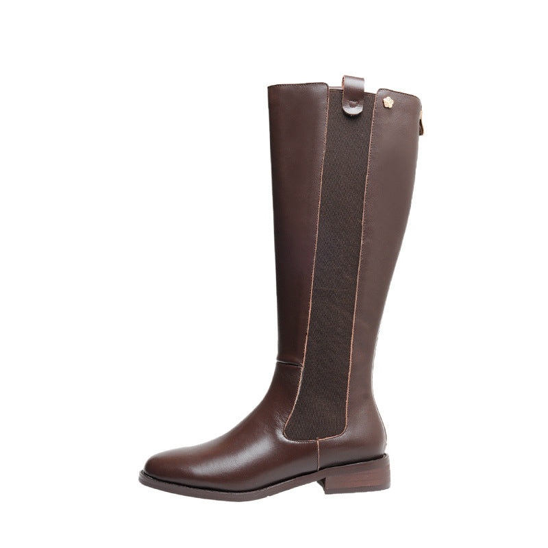 Cowhide Low-heeled Knight Boots Women Thick Legs Double Elastic