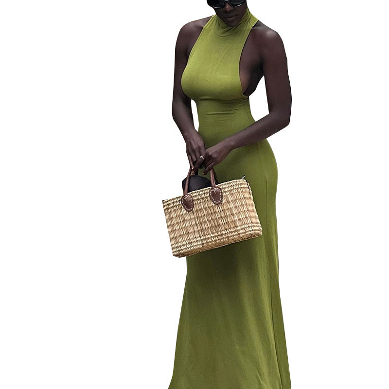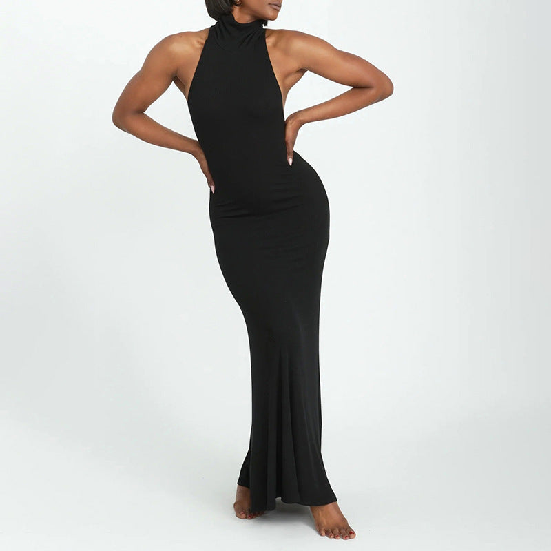 Elegant Solid Color Turtleneck Sleeveless Slim High Waist Length Dress