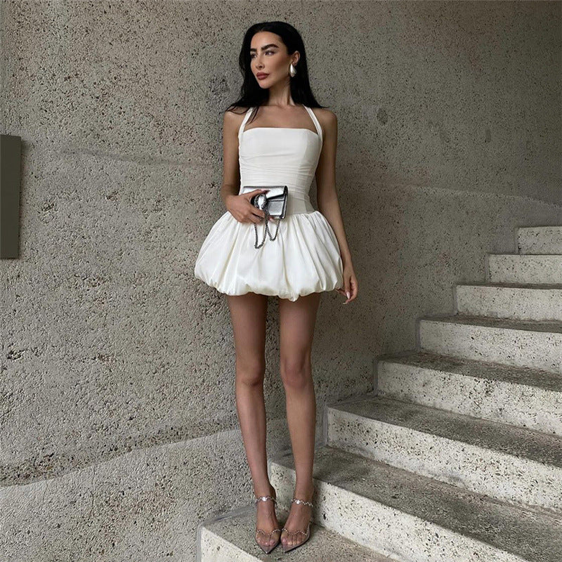 Sweet Elegance Sleeveless Lace-up Halterneck Solid Color High Waist Slim Fit Bud Skirt