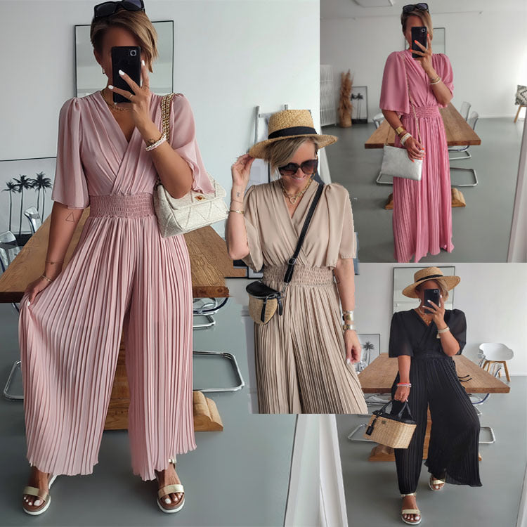 Four Seasons Home Fashion Pleated V-neck Leisure Vacation Wide-leg Pants Jumpsuit