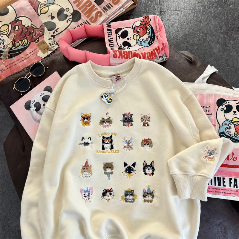 Full Printed Kitten Embroidery Street Fashion Women's Sweater Coat