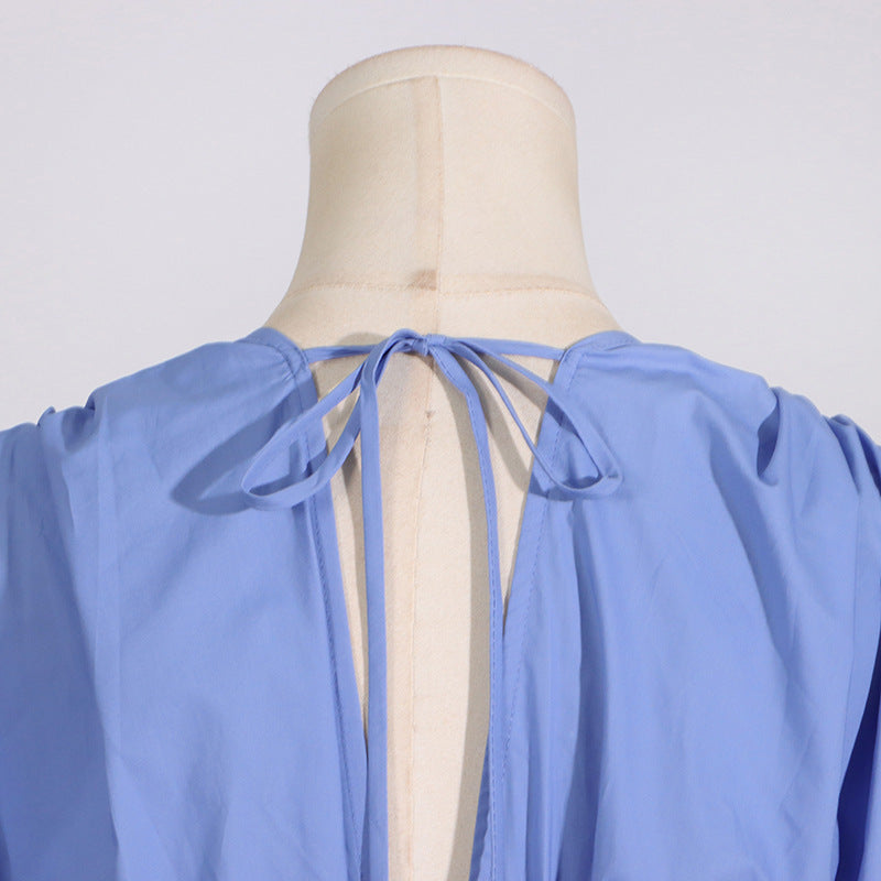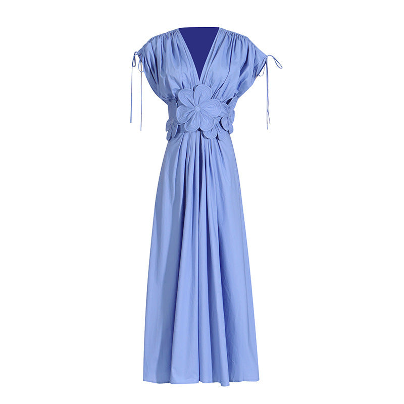 V-neck Lace-up Pleating Design Flower Stitching High Waist Dress