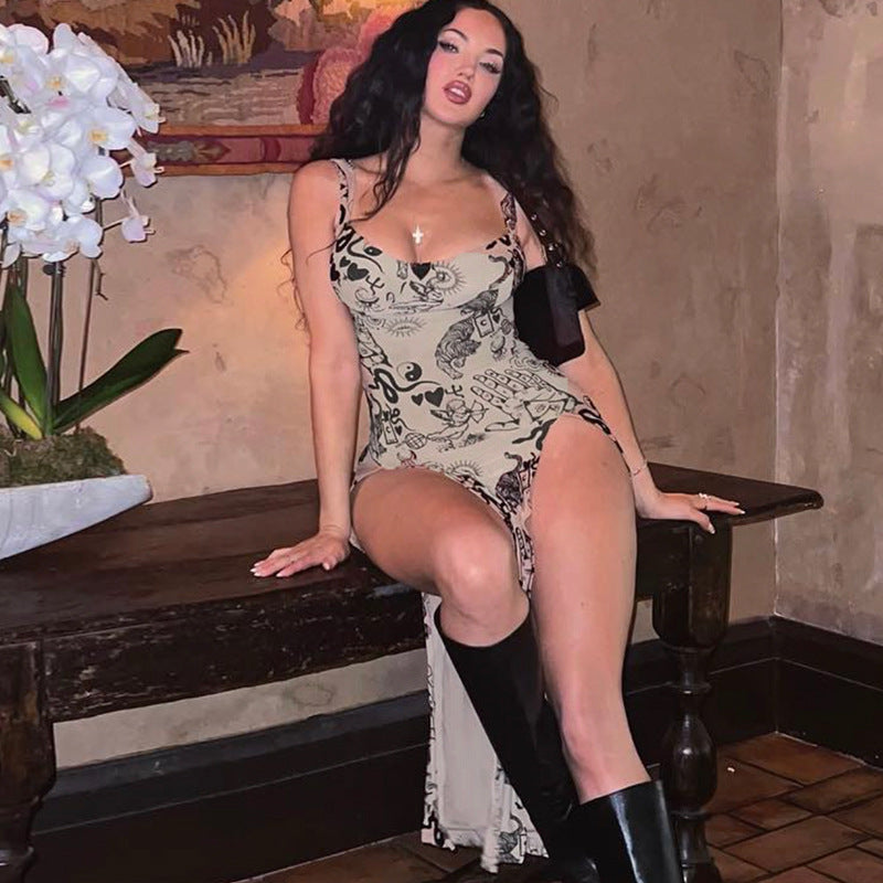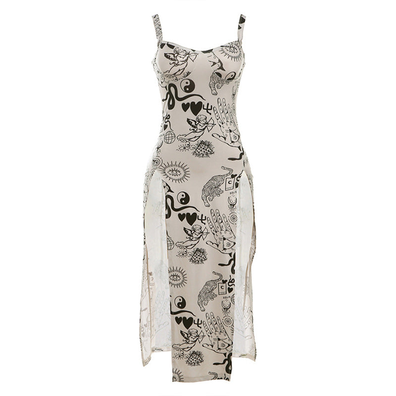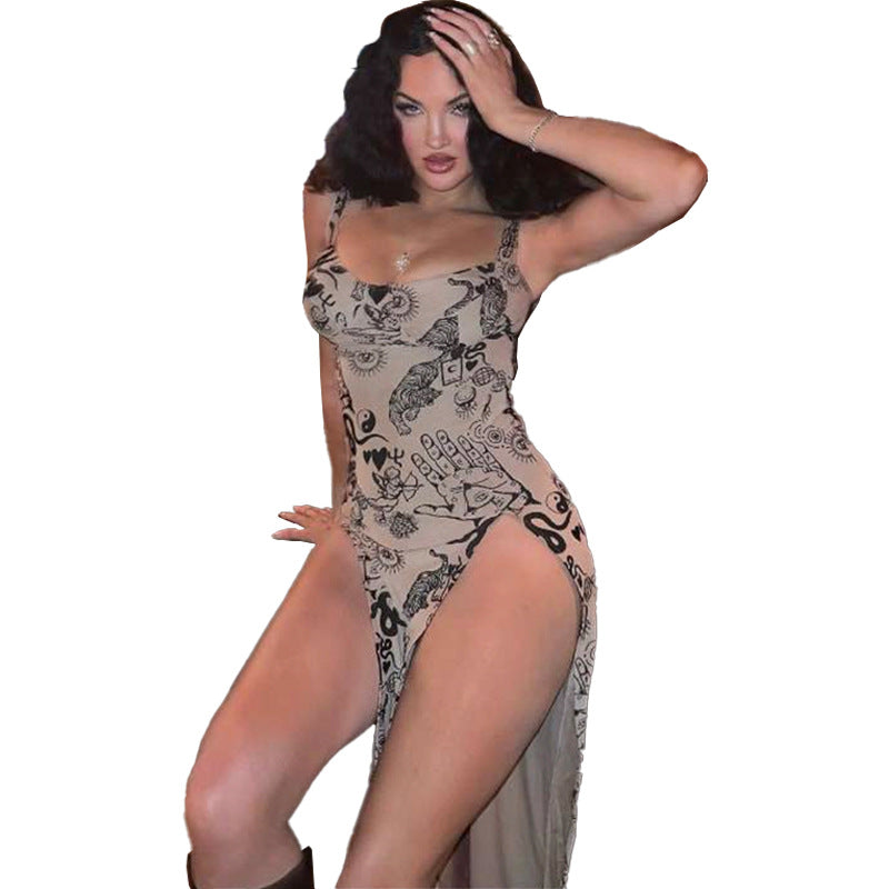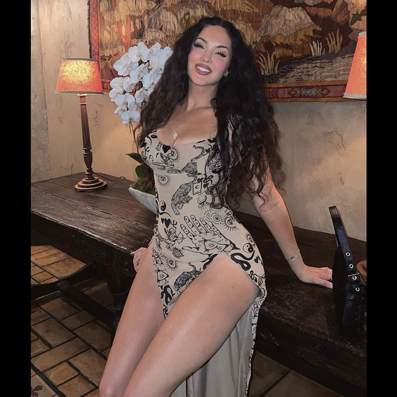 Women's Fashion Printed Slim Fit Slit Backless Sling Dress